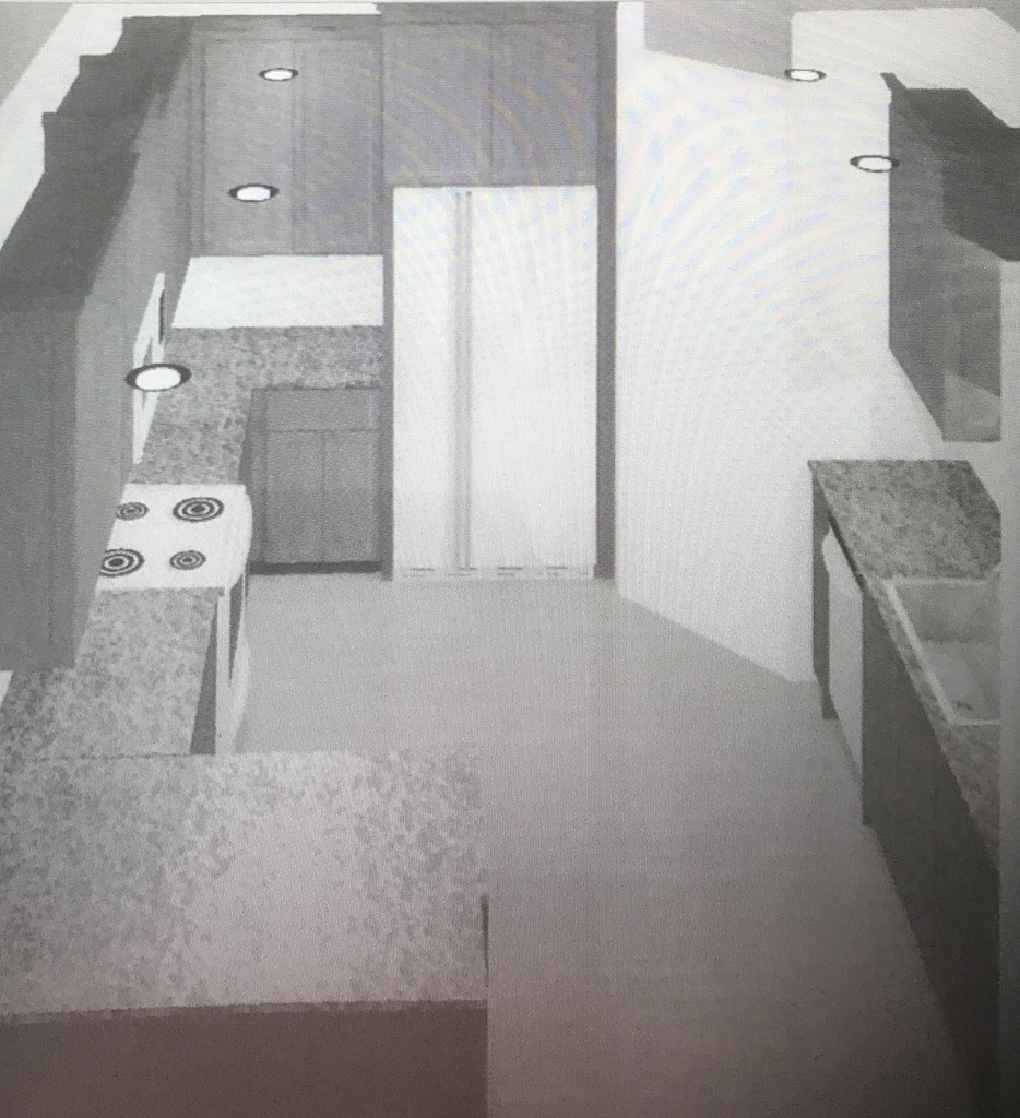 We’ve selected a very calm color palette for this home. The interior will be painted SW 7627 White Heron with the trim and doors in SW 6071 Popular Gray. The full kitchen is off to the right and Olivia has selected SW 6071 Popular Gray for her kitchen cabinets too and we will install a Calcutta Marble top.